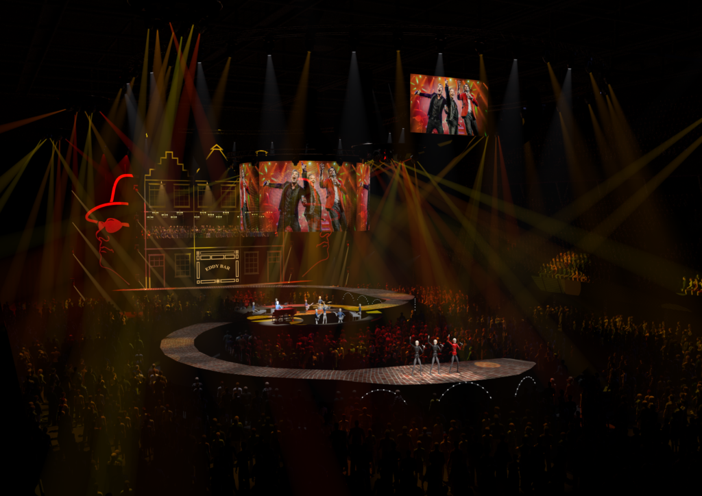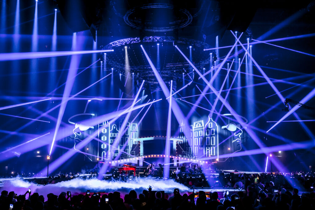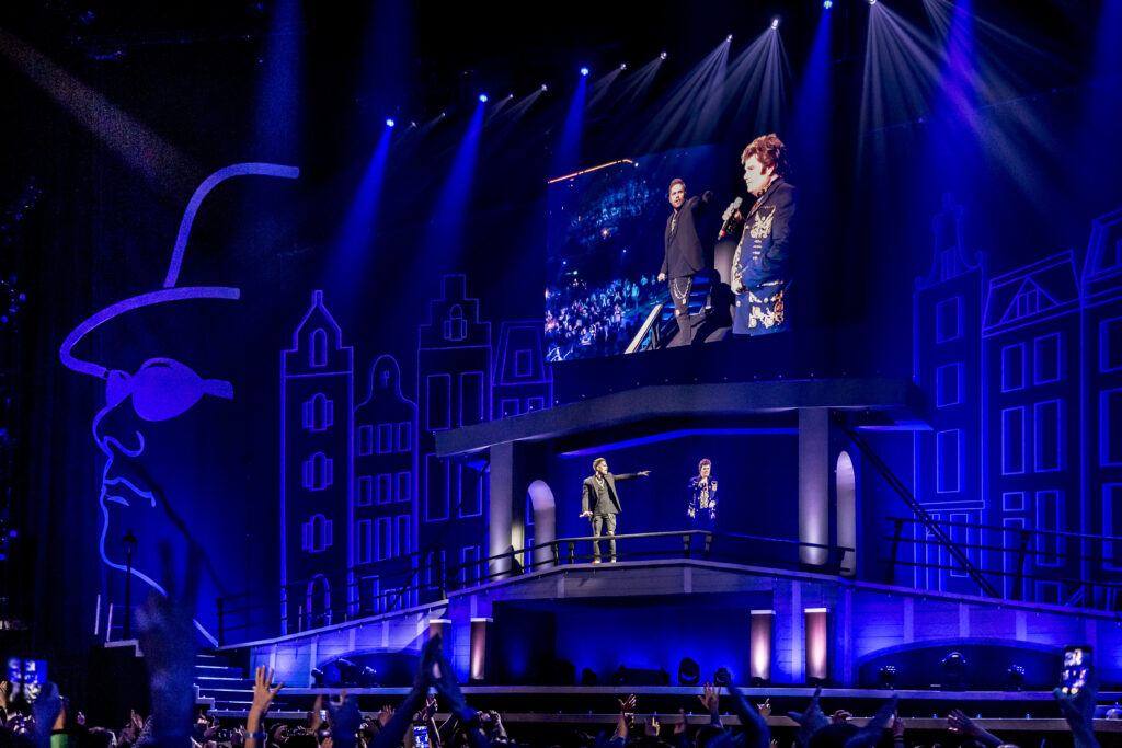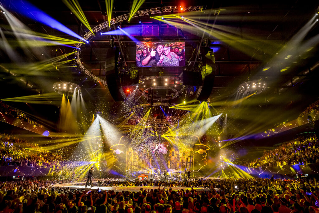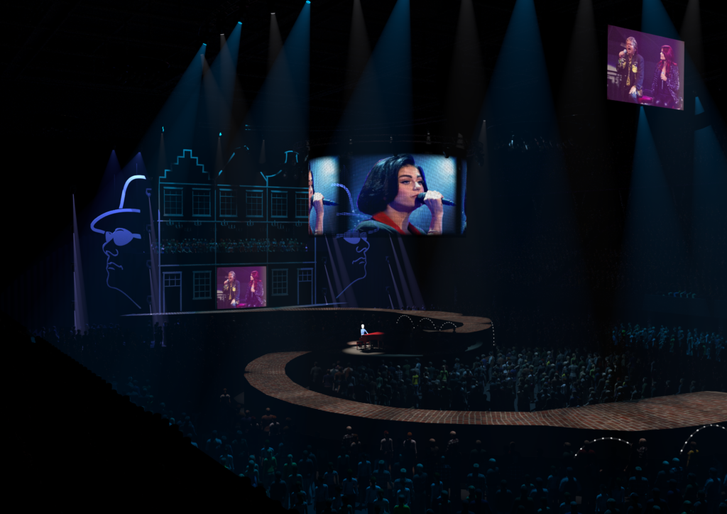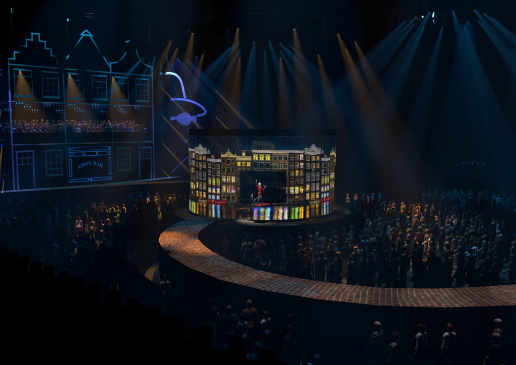 Medialane's desire was to bring the artists closer to the audience, serving as the foundation for both 2019 and 2020. Drawing inspiration from Amsterdam's winding canals, we laid a long catwalk in the venue. By placing the band, along with a video cylinder, in the center of this catwalk, the focus was truly on the audience. In 2020, we added three Amsterdam-style houses at the end of the catwalk, complete with a surprise show effect, allowing Roxanne Hazes to sing a duet with her father.